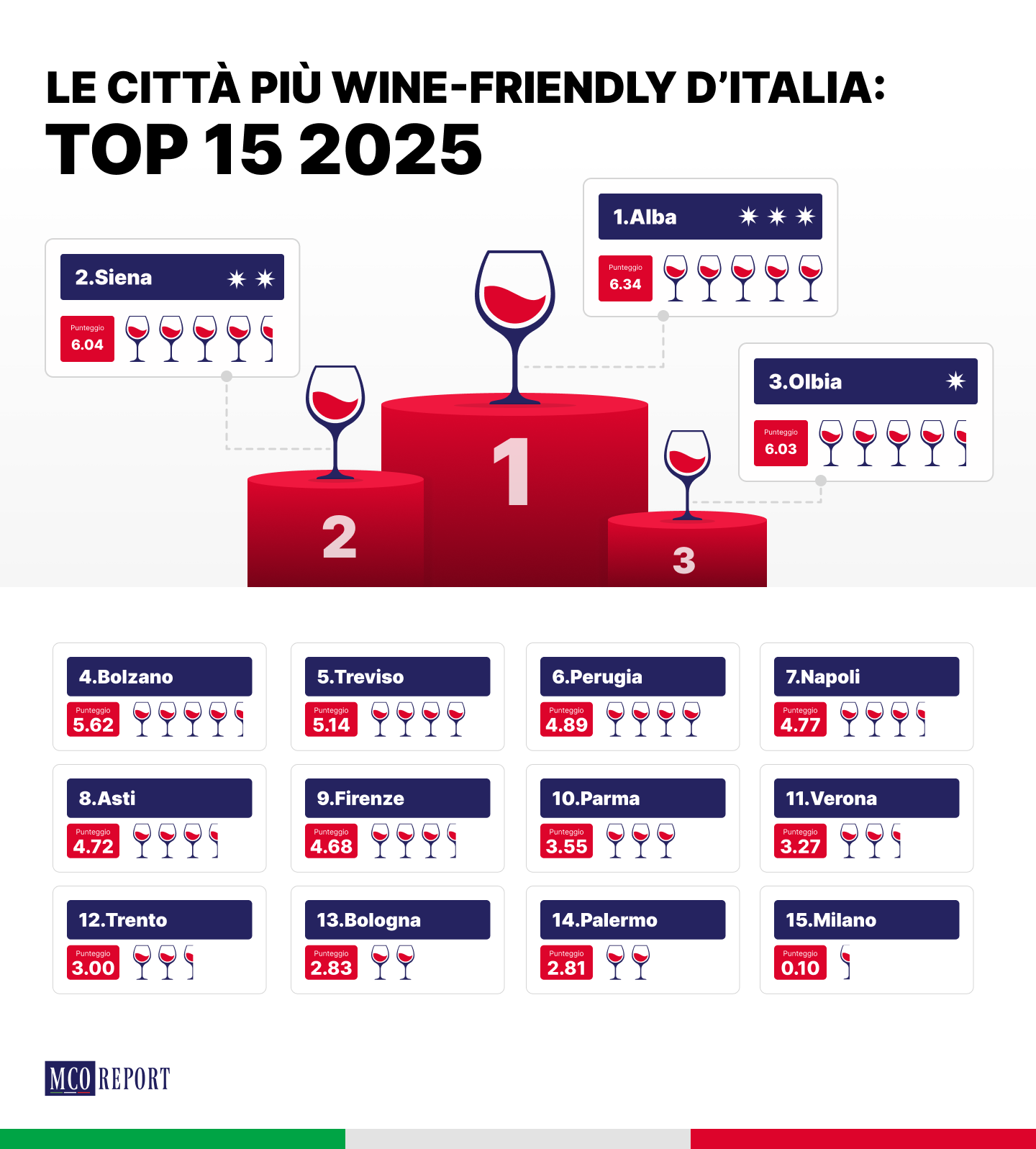 Al primo posto troviamo Alba, con un punteggio di 6,34, a conferma del legame indissolubile tra la città piemontese e il suo territorio vinicolo di eccellenza, dalle Langhe al Barolo. Segue Siena (6,04), che consolida la reputazione della Toscana come una delle regioni più prestigiose al mondo per la cultura del vino. Sul terzo gradino del podio si colloca Olbia, che unisce l’attrattiva turistica della Sardegna a una sorprendente densità di locali dedicati al vino e a prezzi ancora accessibili.